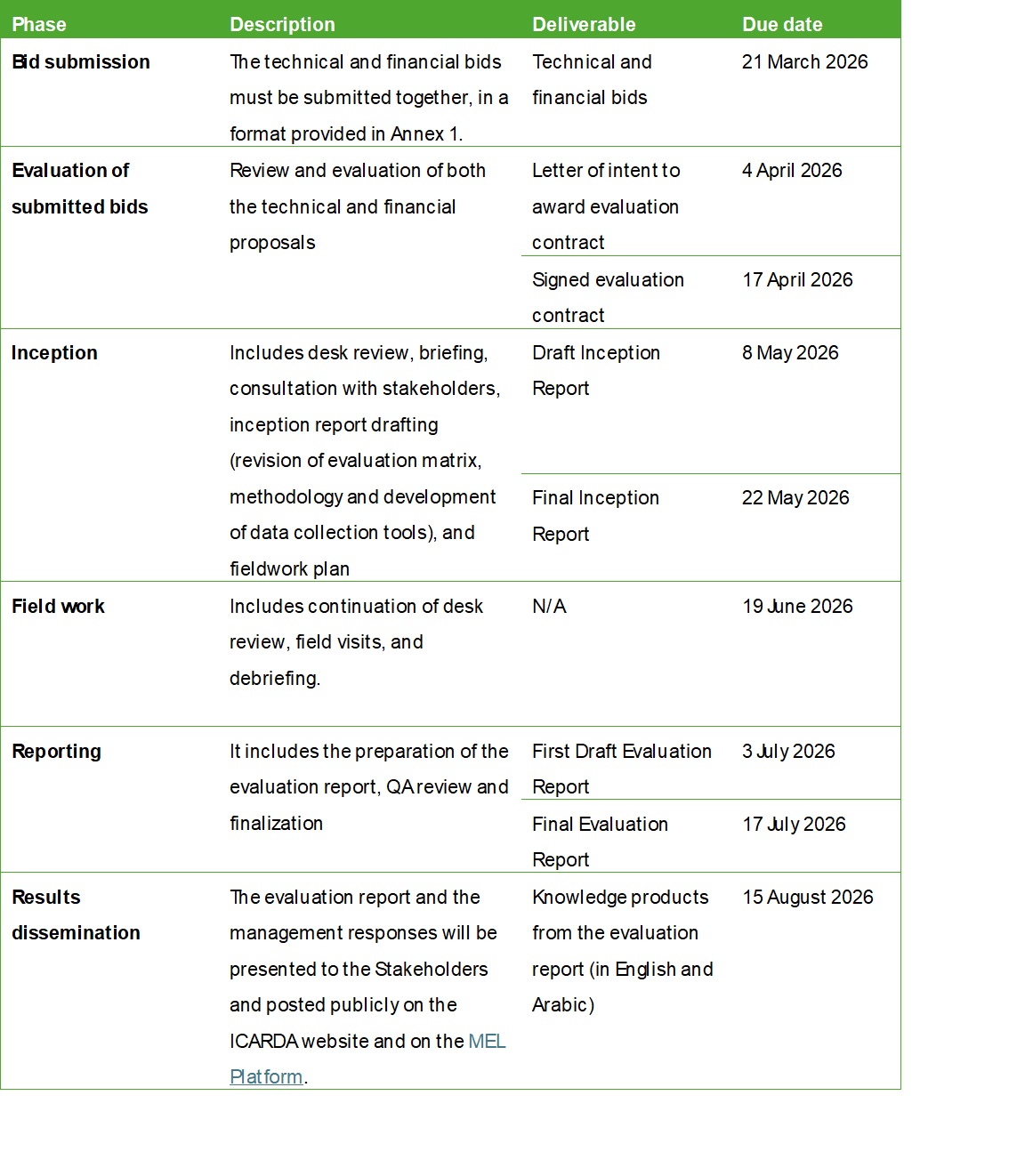 The evaluation assignment is to be completed by 30 June 2026. The tentative schedule for the evaluation with estimated timelines and deliverables is presented below.