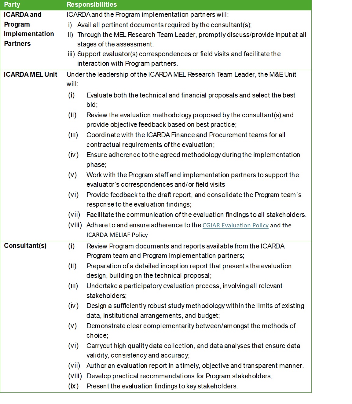(i) Clear use of an evaluation design matrix that is responsive to the CGIAR evaluation criteria.
